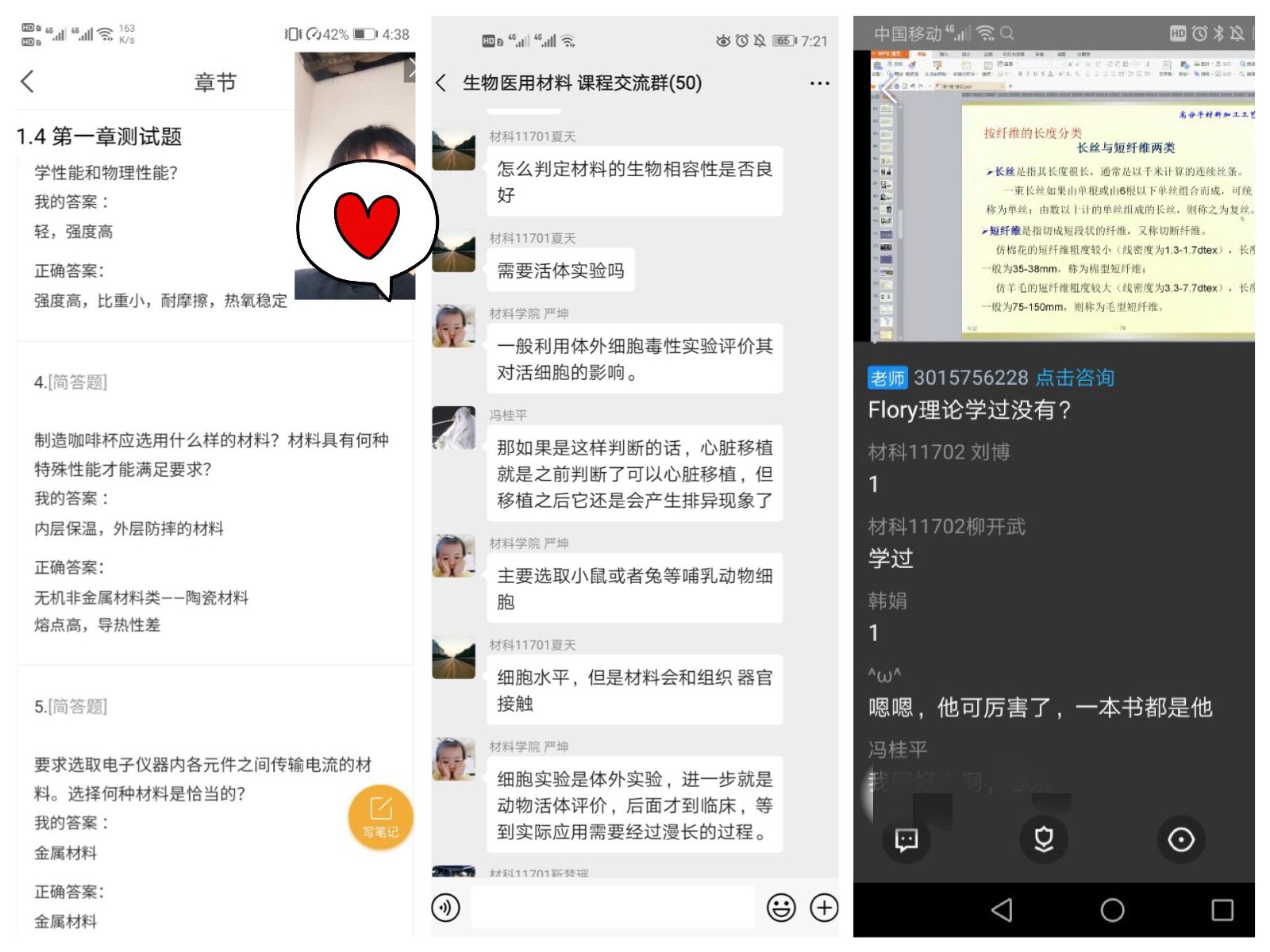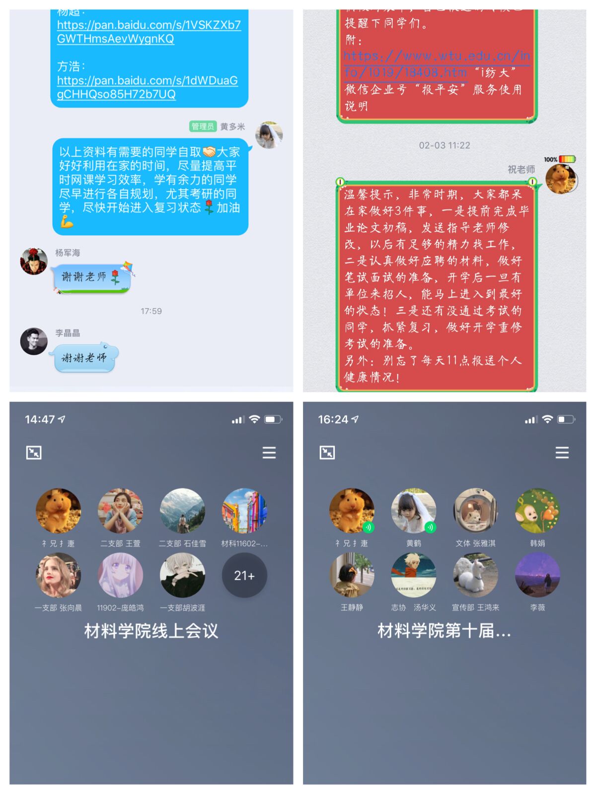 为确保“网课”的顺利有序开展,学院多次召集全体教师、辅导员开展视频“云”会议,就线上教学相关问题进行交流讨论,筹划各项准备工作。学院建立了“材料导论””高分子化学”“材料科学与工程基础””材料化工基础””专业英语”等5门课程群,并分别设立了课程负责人。学院教师纷纷化身“主播”,使出各自“十八般武艺”,利用超星、爱课程和QQ群等平台,融入知识解读、互动答疑、课后作业打卡等环节,上好网课,严守线上教学质量关。