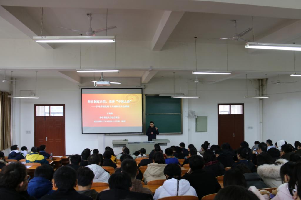 为深入学习领会贯彻党的十九届四中全会精神和习近平新时代中国特色社会主义思想,12月19日下午,十九届四中全会精神武汉纺织大学宣讲团成员、马克思主义学院教授王海燕赴英国正版365官方网站、现代纺织学院做专题宣讲。英国正版365官方网站党委副书记秦梦主持报告会,近两百名师生参加学习。