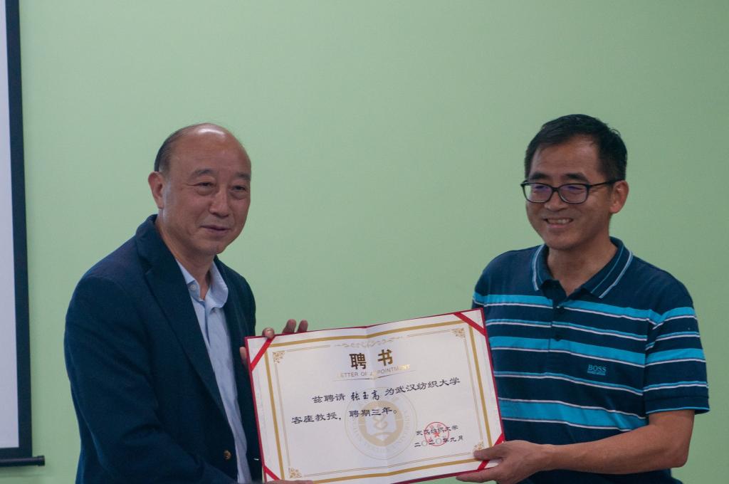 在颁奖典礼上,武汉纺织大学校党委常委、副校长姜明华教授致辞。他对远道而来的溢达集团各位领导表示热烈的欢迎和诚挚的问候,对长期以来关心支持学校事业发展的溢达集团表示衷心地感谢,对各位评委表示由衷的感谢。他表示今年是中国共产主义青年团成立百年,也是党的二十大召开之年,希望同学们不懈努力,勇于创新,鼓励学生们为社会进步做出贡献。随后,他为溢达集团首席科学家&集团研发总监张玉高先生颁发了客座教授聘书。张玉高先生对校方表示感谢,希望能与学校继续加深合作,不断创新合作模式,共同为促进校企才培养做出努力。