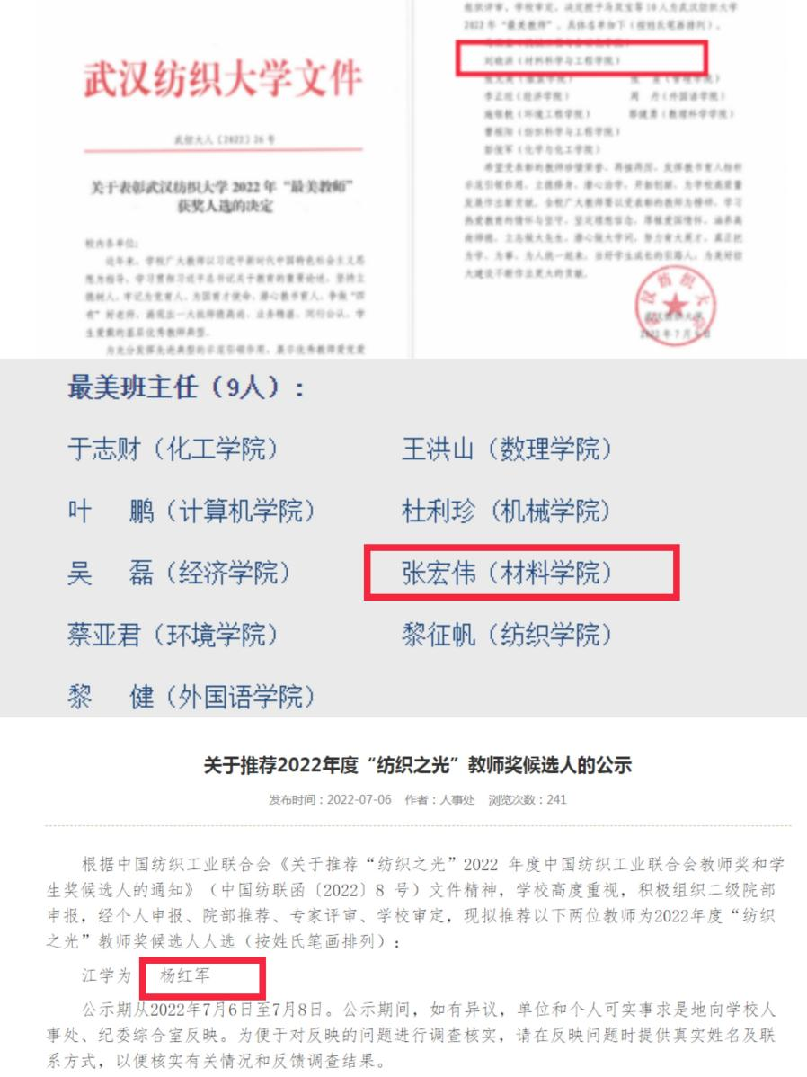 学院获武汉纺织大学最美教师1人,获武汉纺织大学最美班主任荣誉称号1人;获得纺织之光奖教金1人。本科生获国家奖学金2人,国家退役士兵助学金4人。研究生获国家奖学金3人,学业奖学金81人。