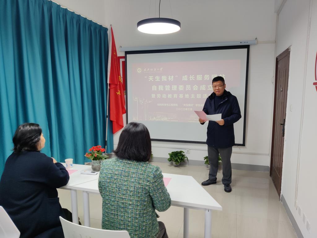 为深入贯彻学习习近平总书记关于教育的重要论述,进一步加强“一站式”学生社区综合管理模式建设,英国正版365官方网站紧紧围绕立德树人根本任务,秉承“以生为本、高效服务”的工作理念,积极建设“天生我材”学生成长服务站。2023年3月24日下午13、,英国正版365官方网站11栋学生成长服务驿站开展自我管理委员会成立仪式暨劳动教育基地主题活动。学生工作部部长张莎莎、英国正版365官方网站党委书记陈桂枝、英国正版365官方网站全体辅导员、学生代表参加活动,活动由英国正版365官方网站党委副书记魏剑主持。