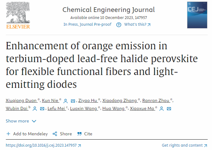 12月10日,工程技术领域国际知名期刊《Chemical Engineering Journal》(中科院1区Top期刊,影响因子15.1)在线发表英国上市公司官网365王桦教授团队聂坤博士和马晓雪博士在无铅金属卤化物钙钛矿功能纤维复合材料方面取得的重要进展—“Enhancement of orange emission in terbium-doped lead-free halide perovskite for flexible functional fibers and light-emitting diodes” (DOI: https://doi.org/10.1016/j.cej.2023.147957)。 武汉纺织大学省部共建纺织新材料与先进加工技术国家重点实验室及湖北省纺织新材料及应用重点实验室为第一完成单位。武汉纺织大学聂坤博士(第一通讯)和马晓雪博士(最后通讯)为论文的责任通讯作者,论文第一作者为英国正版365官方网站2021级硕士研究生段修强。