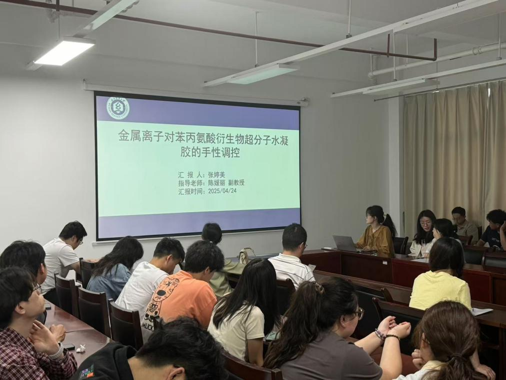 张婷美同学汇报了《金属离子对苯丙氨酸衍生物超分子水凝胶的手性调控 》的研究。超分子水凝胶由小分子凝胶因子通过非共价键自组装形成三维网络结构。研究发现,金属离子(如钴、锰、镍等)能显著影响凝胶的手性表现,通过圆二色光谱(CD)和紫外-可见光谱分析其手性特征。实验还计划进一步探究其他模板及外界刺激对手性调控的影响,为设计新型手性超分子材料提供了理论基础和实验方法。