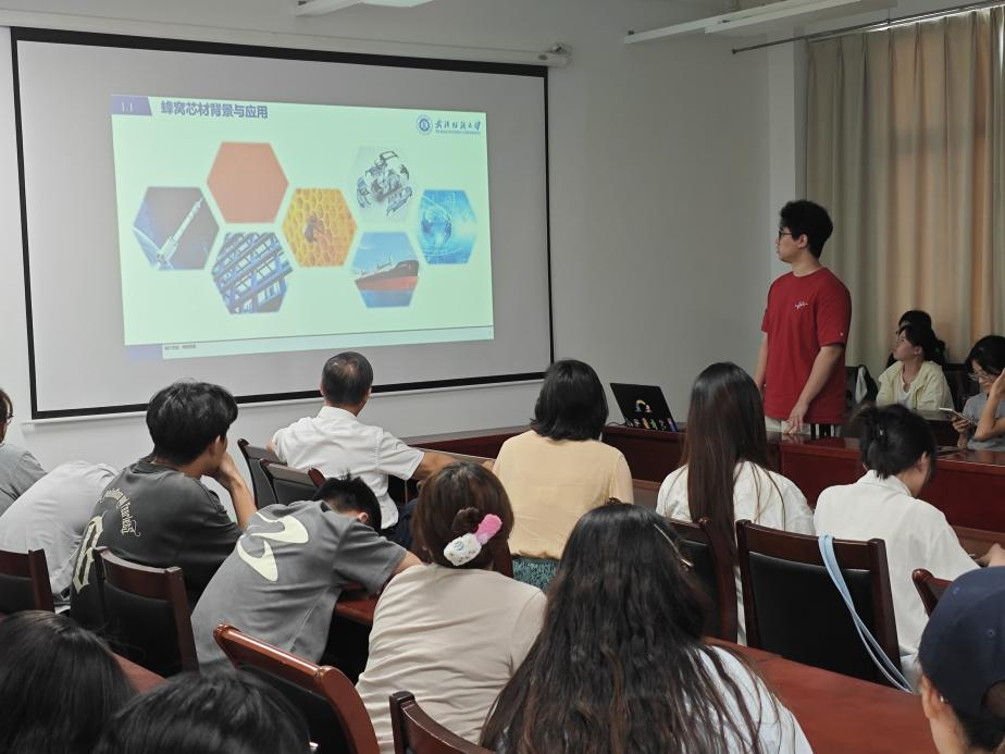 王敬贤同学以《热致液晶聚芳酯纳米纤维蜂窝的成型工艺与性能调控研究》为题进行汇报。针对传统芳纶蜂窝制备工艺复杂、节点结合差等核心难题,创新性开发熔融纺丝-湿法剥离-模板热焊接三联工艺,通过热塑性分子链的可逆熔融机制实现纤维网络一体化成型(热压温度160℃),成功制备PAR纳米纤维蜂窝。该材料突破性实现压缩强度164 MPa(达商业芳纶蜂窝3.9 MPa的41倍),微观结构表征(SEM)显示深度纤维搭接与一体化节点特征,Micro-CT证实结构连贯性(孔隙率<3%)与均匀应力分布(有限元仿真显示无局部应力集中)。经人体/车辆碾压测试保持几何完整性,250℃热老化及UV辐照后强度保持率超85%;基于闭环回收特性实现材料再生利用(循环3次强度衰减<8%),为航空航天轻量化结构材料提供兼具超强力学、环境耐受与绿色可持续的创新解决方案。