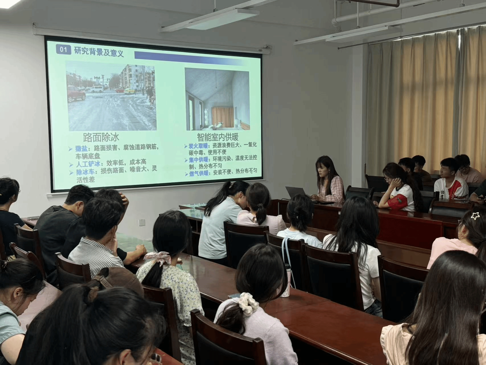 郝彦同学以《利用石墨热膨胀制备自热导电水泥复合材料》为题进行汇报。传统路面除冰方式如撒盐、人工铲冰和除冰车等,存在损害路面、效率低、噪音大等缺点;传统室内供暖方式如炭火取暖、集中供暖和燃气供暖等,存在资源浪费、环境污染、温度无法控制等问题。为了解决这些问题,郝彦同学通过引入石墨作为导电填料,成功制备了自热导电水泥复合材料。实验结果表明,该复合材料具有良好的自热性能和力学性能,且温度分布均匀,升温、降温迅速,有望在智能室内供暖和路面除冰等领域得到广泛应用。