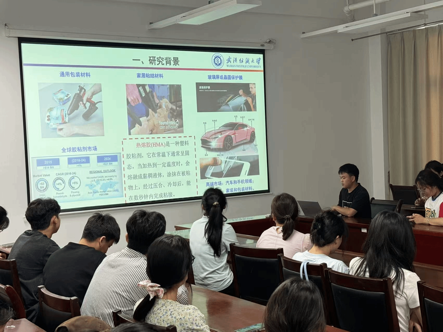 吴明雄同学以《氯化聚丙撑碳酸酯的高性能化及其在胶黏剂的应用》为题进行汇报。随着环保要求的日益严格和高端市场对胶粘剂性能需求的不断提高,传统石油衍生物基热熔胶面临诸多挑战,如不可生物降解、粘结性能不足、溶剂型产品占比高等问题。吴明雄同学的研究聚焦于解决这些问题,通过引入PBAT和MDI作为扩链剂,对CPPC进行改性,成功开发出一种高性能、生物可降解的热熔胶。实验结果显示,改性后的CPPC/PBAT共聚物热熔胶具有优异的粘结强度,其值达到13.20±0.65 MPa,远高于市场上常用的聚氨酯热熔胶等产品。此外,该热熔胶还具有良好的耐水性,即使在沸水中浸泡一段时间后,其单面剪切强度仍能保持在6 MPa左右。同时,该材料还具备可生物降解、不含溶剂和甲醛、工艺简单的优点,符合环保和可持续发展的要求。吴明雄同学的研究不仅为热熔胶的高性能化和环保化提供了新的解决方案,还为生物质复合板材的开发提供了技术支持。该研究有望在家居粘结、玻璃屏保护、通用包装等领域得到广泛应用,推动相关行业的发展。