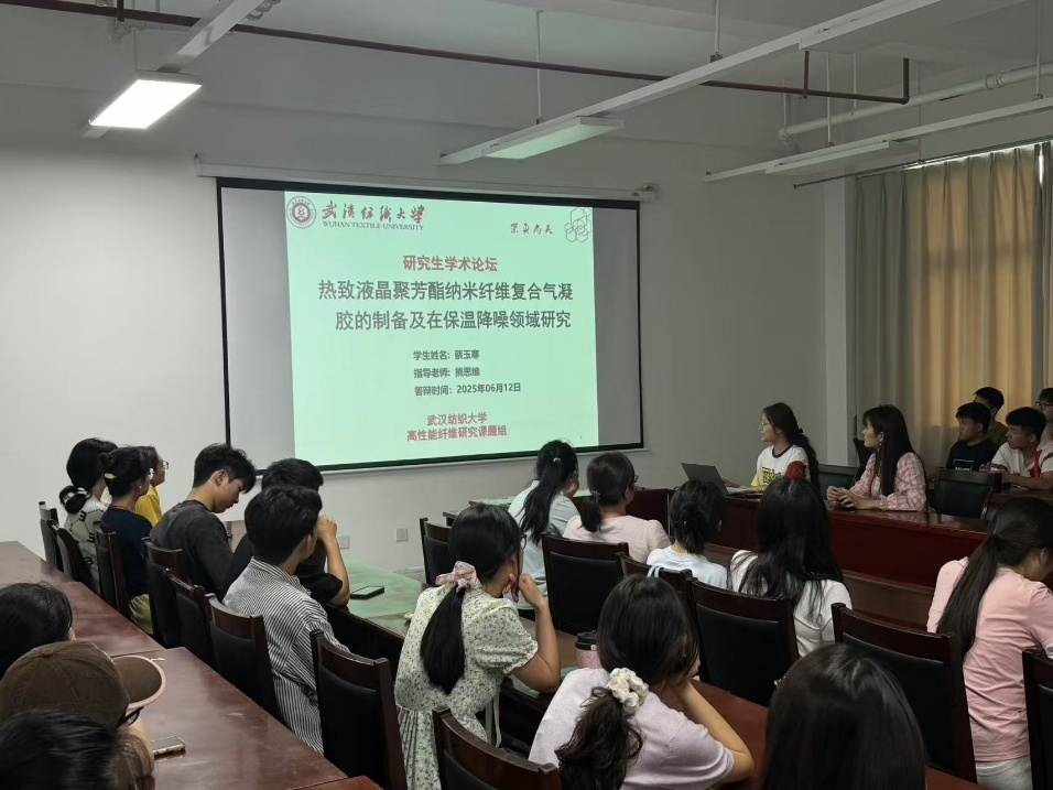 蔡玉寒同学以《热致液晶聚芳酯纳米纤维复合气凝胶的制备及在保温降噪领域研究》为题进行汇报。随着城市化和工业化进程的加快,噪声污染和能源枯竭问题日益突出,开发高效的保温降噪材料成为当务之急。蔡玉寒同学的研究聚焦于此,成功制备了二氧化硅 / PAR 纳米纤维复合气凝胶。该材料利用 PAR 纳米纤维构建三维高孔隙网络,同时借助二氧化硅中空微球的特性,实现了优异的热声绝缘协同性。实验结果显示,当二氧化硅含量为 30% 时,复合气凝胶的热导率低至 0.023 W/m·K,远低于传统商业聚氨酯泡沫。此外,该材料还具备良好的机械柔性、可回收性等优点,在保温降噪领域得到广泛应用。