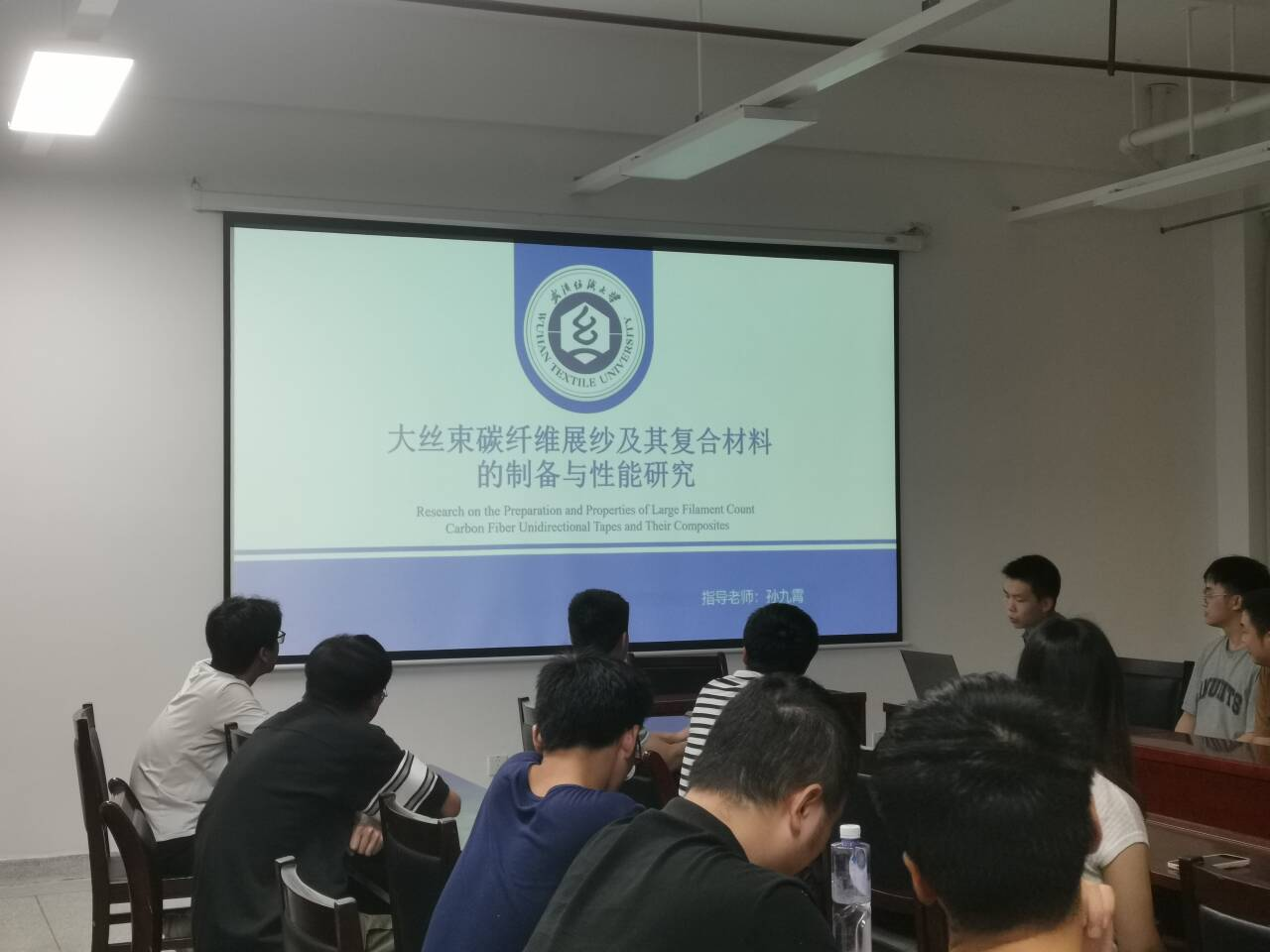 刘东升同学汇报的《大丝束碳纤维展纱及其复合材料的制备与性能研究》,聚焦大丝束碳纤维在高端制造领域的应用瓶颈,系统探究了展纱工艺对材料性能的优化机制。汇报中详细介绍了机械多辊筒、超声杆、超声池、气流喷射四种展纱方法,通过调控温度、出水角度、展纱辊数量等关键参数,成功将48K碳纤维原纱宽度从15mm拓展至30mm,且展纱后纤维分散均匀性显著提升(1300倍电镜下可见纤维排布更规整)。基于展纱后的碳纤维制备的复合材料,面密度从423.33g/m²降至316.20g/m²,在轻量化的同时保持了良好的力学性能,其中48K-20mm规格复合材料拉伸应力达549.72MPa,为轨道交通、风电叶片、航空航天等领域的低成本、高性能复合材料应用奠定基础。