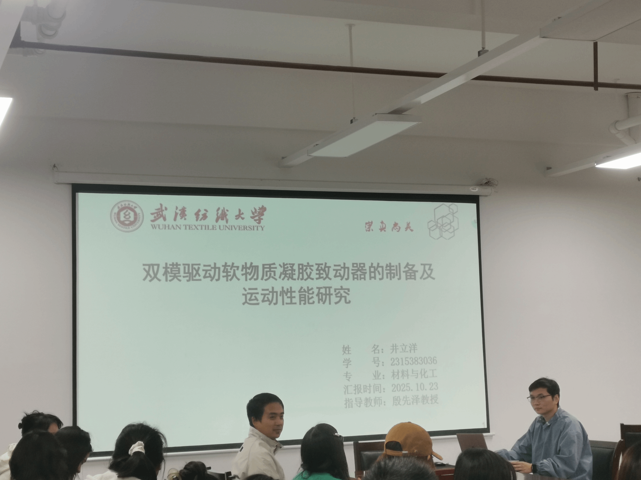 井立洋同学汇报的《双模驱动软物质凝胶致动器的制备及运动性能研究》,聚焦现有软物质凝胶致动器响应速度慢、机械强度低、运动可控性差等行业痛点,设计了一种具有双交联结构(镧离子及双烯丙烯酰胺交联)的聚丙烯酰胺 / 海藻酸钠软物质凝胶致动器。该器件创新性地融合了溶剂交换产生的自发驱动力与光热刺激的可控调节功能,通过乙醇 - 水溶剂交换实现长时间、快速的自发性运动,同时利用光热刺激精准调控运动状态。实验验证表明,该凝胶致动器在保持良好机械性能的基础上,实现了从自发运动到可控运动的双模切换,在智能交通和软体机器人领域展现出广阔应用前景。