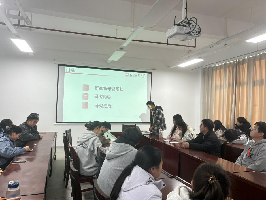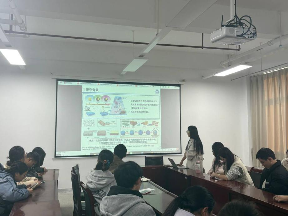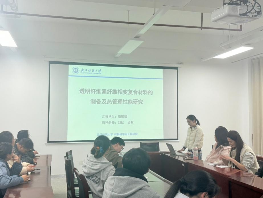 胡璐璐同学汇报了《透明纤维素纤维相变复合材料的制备及热管理性能研究》。她采用“脱木质素-树脂灌注”工艺,将麻纤维制备成可见光透过率>85%、可弯折180°的透明纤维,并引入热致变色微胶囊(TCM)构建辐射制冷/储热可切换的柔性复合材料。实验结果显示,该复合材料在模拟日照下可使模型房温度由45 ℃降至40 ℃,且相变循环100次后性能无衰减,为绿色建筑“零耗能”智能窗提供了新思路。