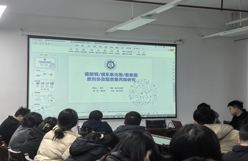 孙笠同学在陈少华老师指导下,汇报《植酸铜 / 镧系氧化物 / 膨胀阻燃剂协效阻燃聚丙烯研究》。针对聚丙烯易燃、耐紫外老化差等缺陷,制备植酸铜(CuPA)并与 MPP、PAPP、TiO₂等复配,开发多功能复合材料。当 CuPA 添加量为 1.125 wt% 时,材料极限氧指数达 28.7%,通过 UL-94 V0 级认证,同时具备良好抗紫外性能和机械性能。植酸铜与其他阻燃剂产生协同作用,可抑制热释放与烟气生成,形成致密残炭层,为阻燃聚丙烯工业化应用提供技术支持。
