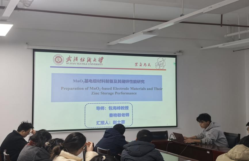 赵士豪同学在包海峰教授、秦艳敏老师指导下,汇报《MnO2基电极材料制备及其储锌性能研究》。研究团队通过控制反应温度和投料比制备 MnO2纳米棒,系统探究Mg2+掺杂及与介孔材料复合对电化学性能的影响。采用水热法制备系列电极材料,经 XRD、SEM、TEM等表征证实,Mg2+掺杂可调节 MnO2晶格间距、增强电导率,显著提升储锌性能,为高性能锌离子电池电极材料研发提供新思路。