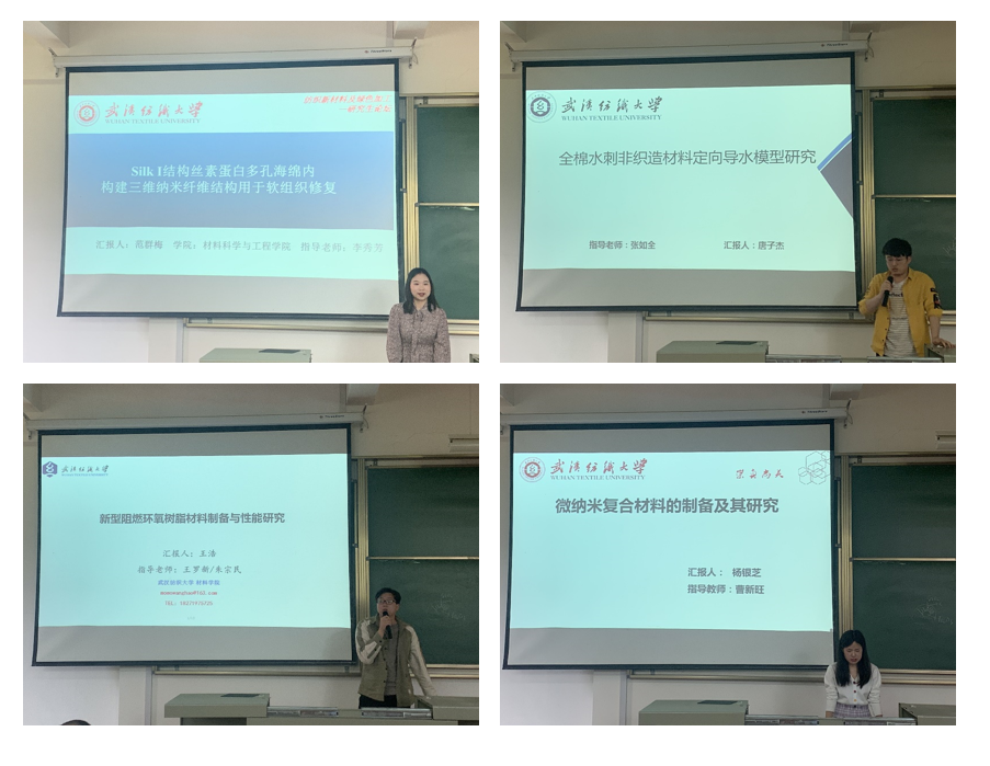 论坛上,曾凡佳、张雅莉、黄智宇、陈梦莹、范群梅、唐子杰、王浩、杨银芝八位同学分别围绕“柔性纤维基热电材料及应用”“棉织物基负载功能性纳米粒子制备及其性能研究”“芳香杂环化合物修饰棉纤维的制备及吸附性能研究”“湖羊毛性能分析及应用研究”“Silk I 结构丝素蛋白多孔海绵内构建三微纳米纤维结构用于软组织修复”“基于专利分析水刺部件的发展趋势”“新型阻燃环氧树脂材料制备与性能研究”“微纳米复合材料的制备及其研究”就自己的研究内容及成果等方面分别进行了汇报交流。