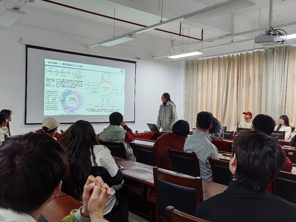陈瑞娜同学的研究通过合成和表征相关材料,构建了具有高自愈合效率和良好细胞相容性的透明质酸基水凝胶体系,旨在提升其力学性能和快速自愈合能力,拓展其在生物医学领域的应用。