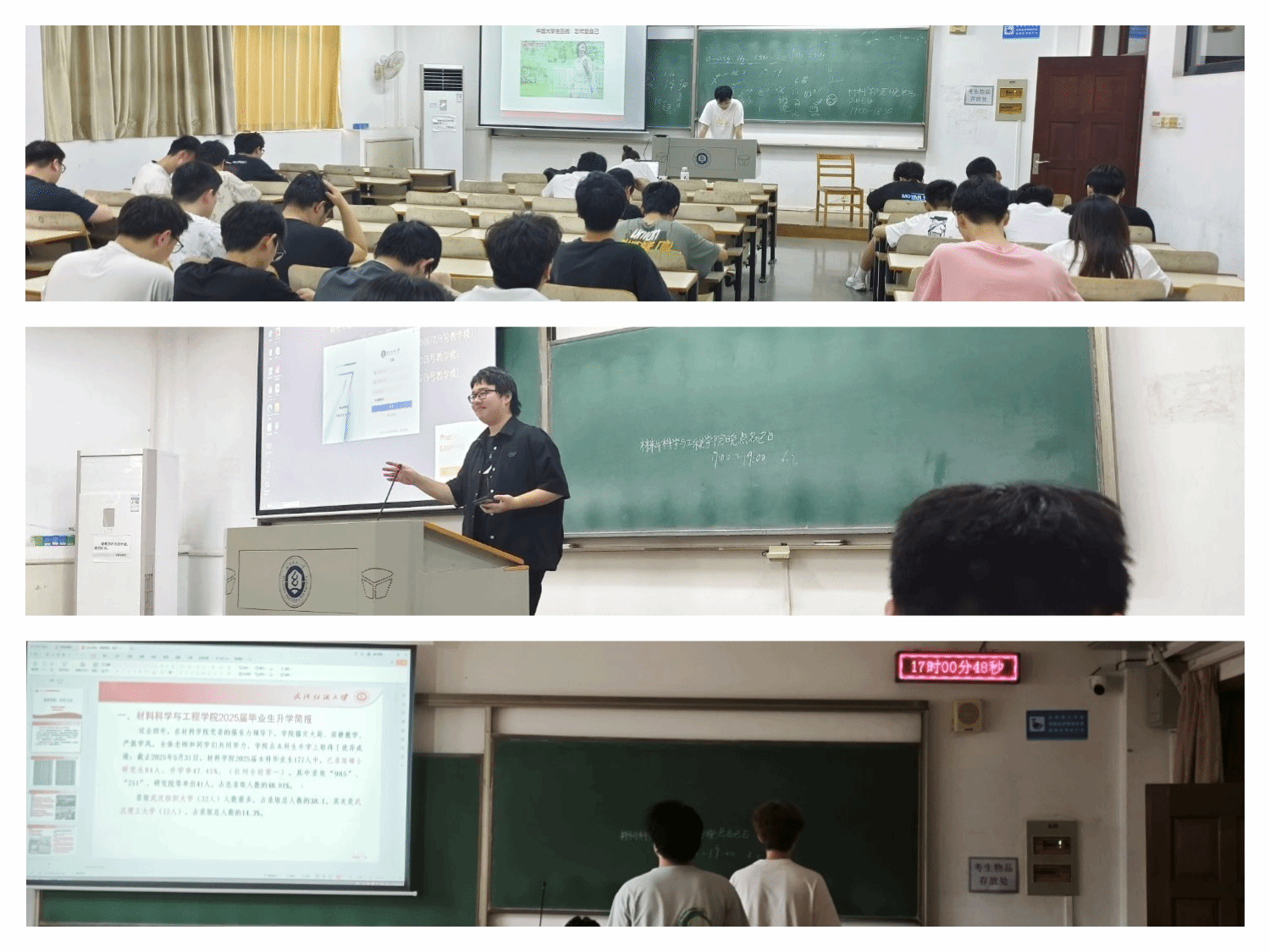 随后,辅导员围绕朋辈领航、诚信应考、文明寝室三大主题,为学子们指引方向、筑牢底线、营造温馨环境。学院聚焦2025届毕业生升学就业成果,展现人才培养实效。过去四年,在学院统筹推动下,升学与就业齐头并进。升学方面,177名毕业生超五成深造,“985”“211”等院校录取率可观,“推免 + 考研”双上岸案例频出;就业上,超七成学子顺利就业,中石化、TC亨昇等名企中有材料学子身影,剑振鹏、王树勋、朱爽等就业达人分享求职心得,激励低年级同学早规划、勇逐梦。考试周临近,学院着重强调诚信应考。从“诚信是公平考试基石”切入,阐明考试作弊入刑后果,结合《中华人民共和国教育法》《武汉纺织大学学生考试违规处理办法》,亮明“零容忍”态度;列举往届违规案例敲响警钟,同时传授心理调适法与备考建议,帮学生以积极心态、科学方法应考,缓解压力焦虑。文明寝室建设环节,学院从安全、卫生、互助、沟通多维度倡议。安全上,禁违规电器、私拉电线,做好防火防盗;卫生上,定期清扫、分类垃圾,营造整洁空间;互助中,室友携手奋进;沟通时,换位思考、化解矛盾,让寝室成“心灵港湾” ,号召学生以寝室为家,守护文明“小阵地”,共建学院文明“大环境” 。
