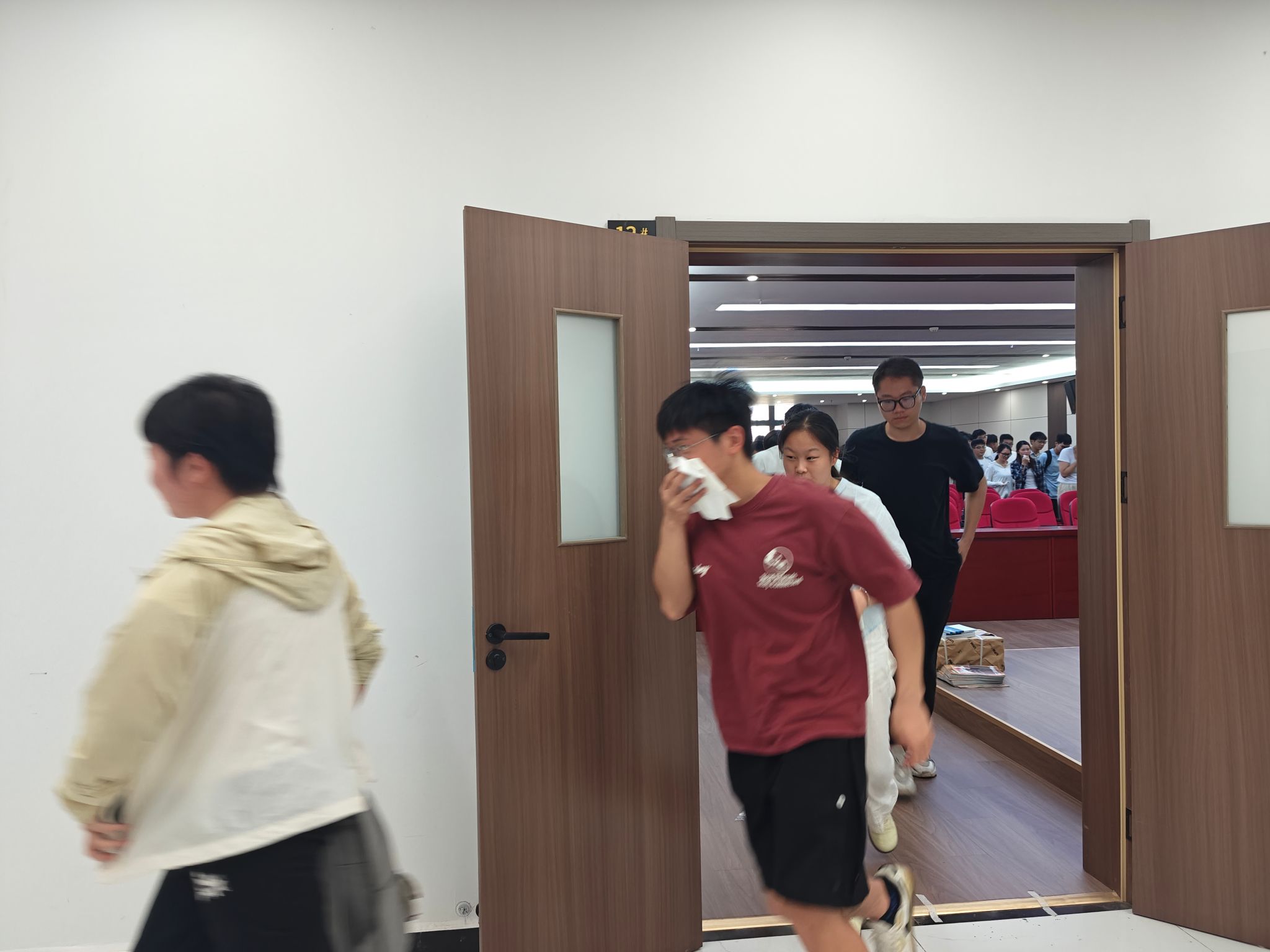 随着模拟烟雾的升起和急促的警报声,紧张的应急疏散演练正式拉开帷幕。在学院辅导员和安保人员的精心组织与引导下,参与演练的研究生同学们迅速进入状态。大家严格按照“捂鼻、弯腰、低姿、靠右”的逃生要领,沿着预定的疏散路线,快速、有序地从教学楼内撤离至指定的室外安全集结区域。整个疏散过程紧张而不慌乱,迅速而有条理,达到了预期的演练效果。通过亲身体验,同学们切实掌握了在紧急情况下如何有效规避风险、迅速安全逃生的实践能力,团队协作和应急反应能力也得到了锻炼。