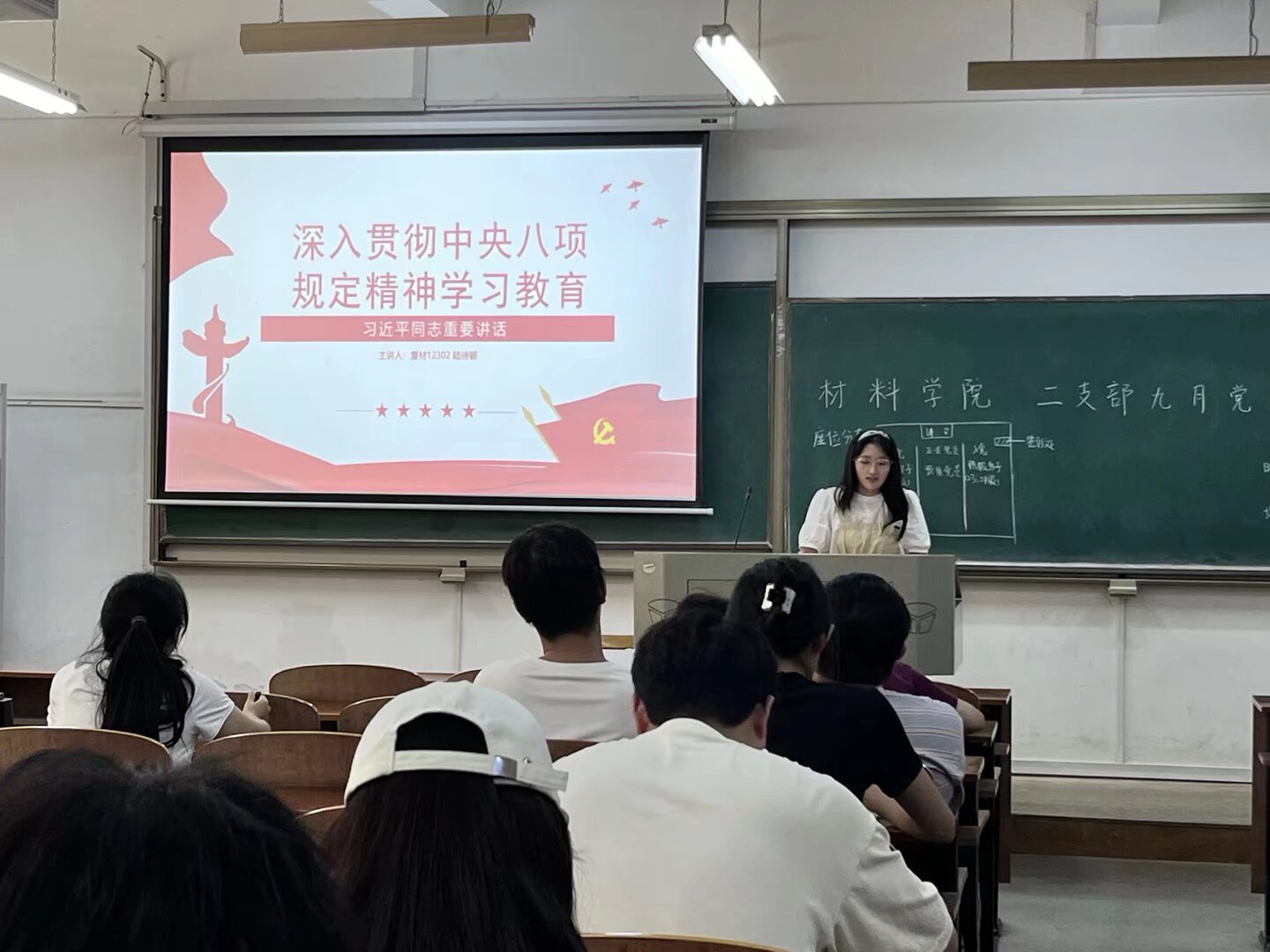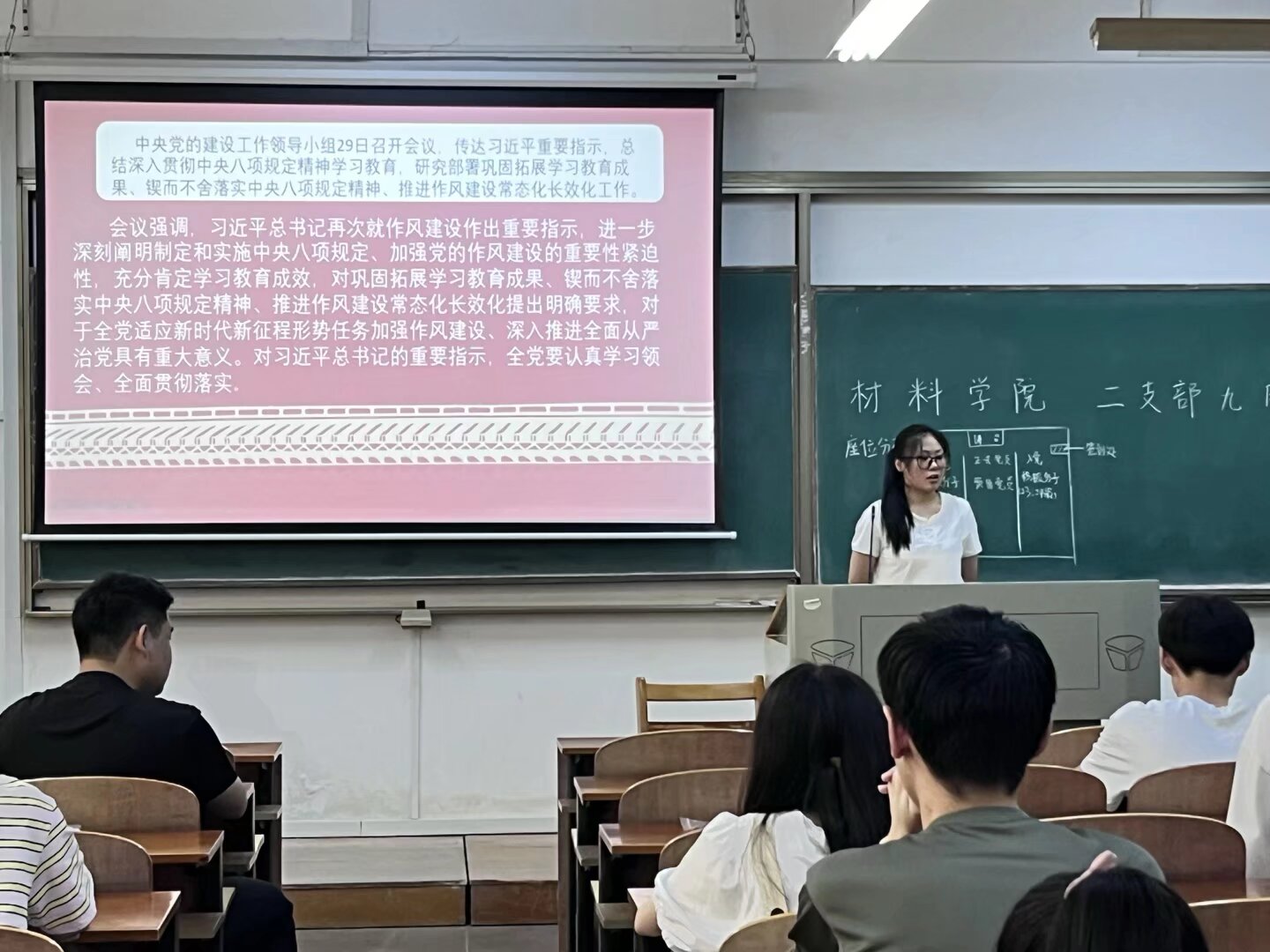 最后,支部书记胡晓重点围绕学生党员如何贯彻落实中央八项规定精神作了强调。指出,习近平总书记就锲而不舍落实中央八项规定精神作出的重要指示,体现了党中央持续推进作风建设的坚定决心。作为学生党员,要深刻认识到贯彻落实中央八项规定精神不仅是对领导干部的要求,也是对全体党员的基本要求,必须从小事做起、从身边做起。他对学生党员提出四点要求:一要坚定理想信念,筑牢思想根基。要将学习中央八项规定精神与党性修养相结合,树立正确的世界观、人生观、价值观,扣好人生的"第一粒扣子"。二要严于律己,培育优良学风。要在学习科研中力戒浮躁,反对弄虚作假,恪守学术规范,以严谨务实的态度完成学业。三要勤俭节约,反对铺张浪费。要在日常生活中践行简约适度的生活方式,不攀比、不浪费,培养艰苦奋斗的精神品质。四要服务同学,发挥模范作用。要密切联系同学,热心集体事务,在服务奉献中展现学生党员的先进形象。