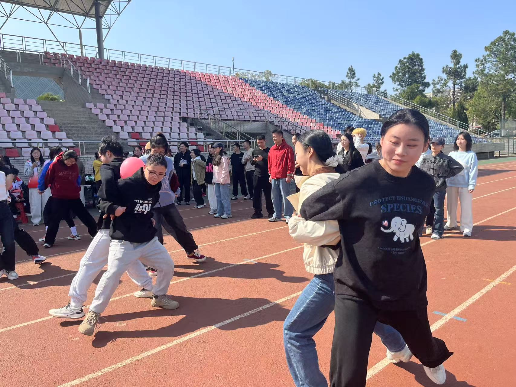 活动项目精彩纷呈,在“一圈到底”项目,同学们手持呼啦圈,迅速排成一列。随着比赛开始的哨声响起,呼啦圈在队伍中快速传递,大家紧密配合,眼神专注,手忙脚乱中又透着默契,现场不时爆发出阵阵欢呼声。紧接着的“鸿运当头”环节,同学们头顶气球,小心翼翼地在赛道上前行。气球的晃动、同学们的笑声交织在一起,构成了一幅欢乐的画面。气球一旦掉落,同学们便迅速捡起,继续投入比赛,彼此之间相互鼓励,毫无怨言。