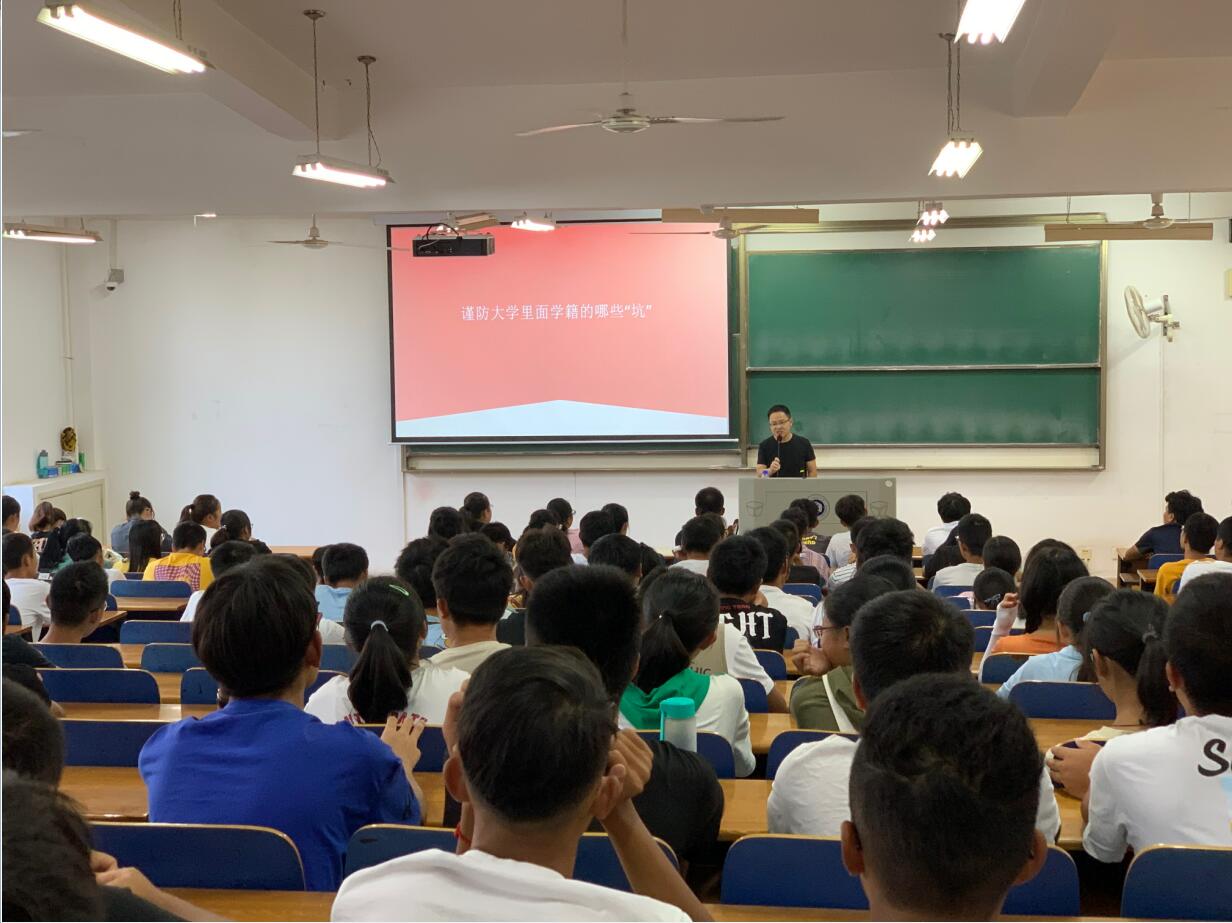 9月30日上午,英国正版365官方网站特邀学校教务处张辉老师为学院2019级新生详细讲解了大学生学籍管理和教学运行相关规定。张老师重点介绍了转专业、休学、退学、重修的问题,升级和留级,选课的问题,成绩的认定以及大学生学位授予有关规定,使材料新生对学校学籍管理有了一个全面的认识。