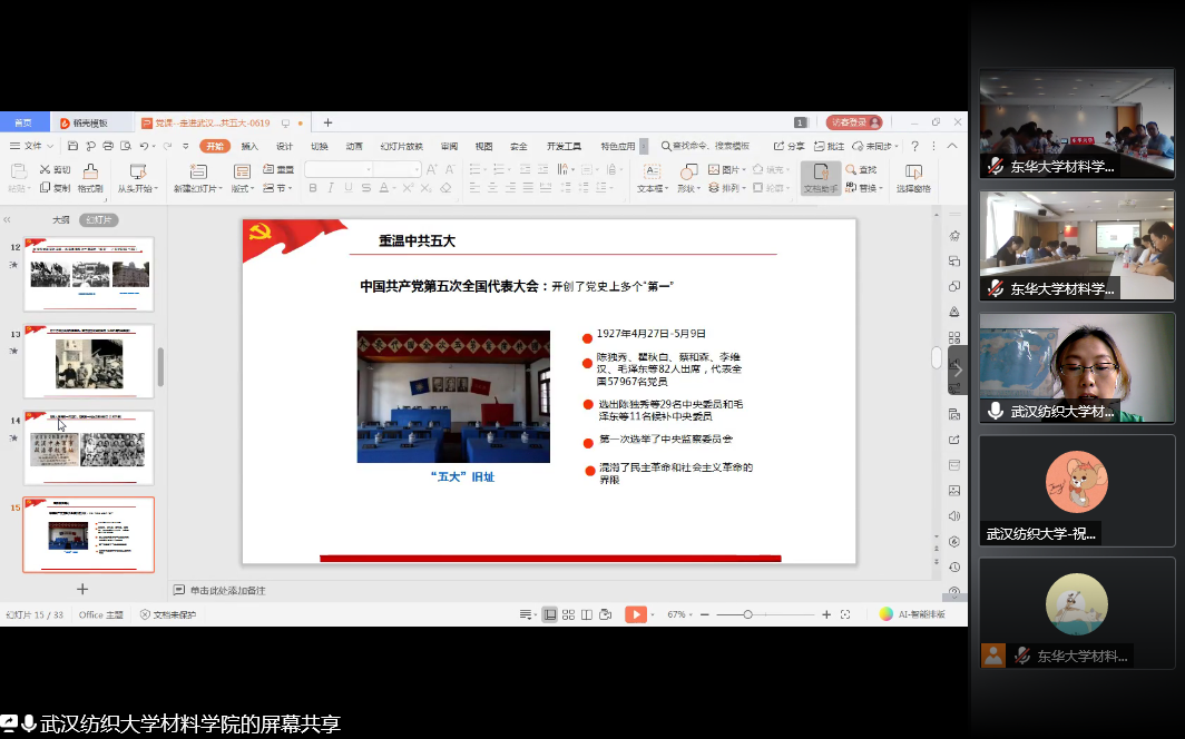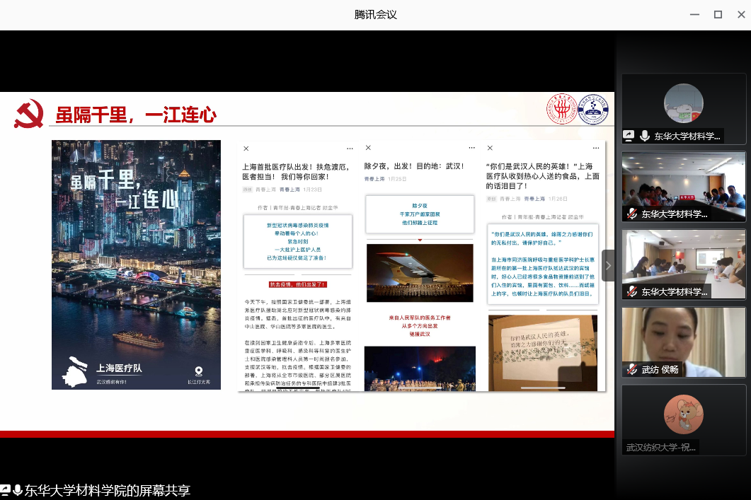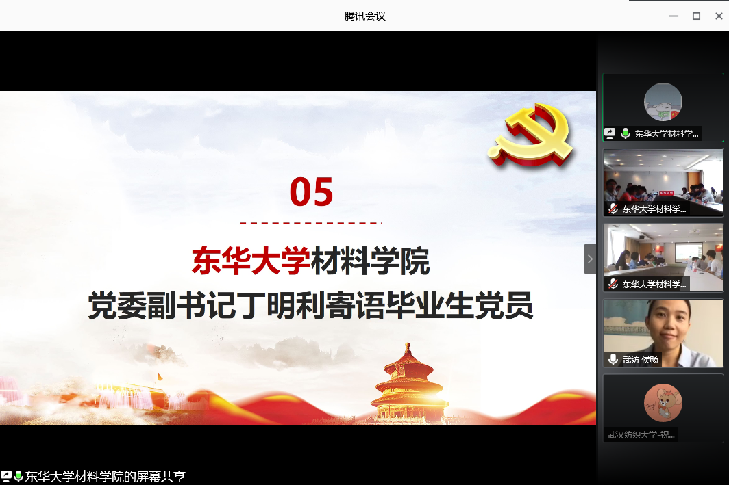 2020 年 6 月 19 日 10:30,英国正版365官方网站与东华大学材料学院在腾讯会议联合开展了“一五一实讲党史,牢记使命展担当”主题党日暨 2020 届毕业生党员离校教育,两院全体毕业生党员参加了此次会议。会议由东华大学英国正版365官方网站学生党建辅导员吴佳主持。