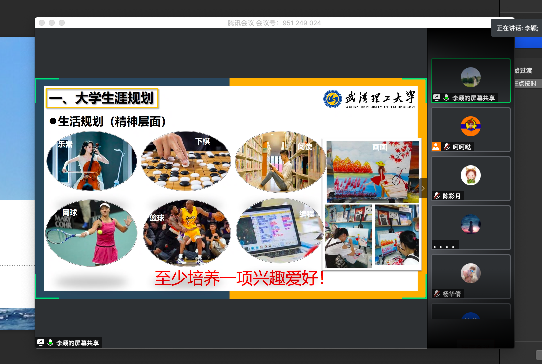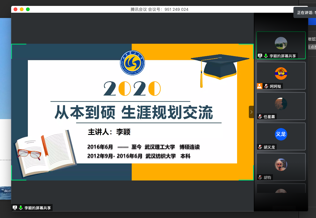 6月4日下午2点,英国正版365官方网站在腾讯会议举办线上成长导航讲座,学院17、18、19级学生和部分环境学院、纺织学院学生参加了会议。本次讲座特邀英国上市公司官网3652016届优秀毕业生、武汉理工硕博连读的李颖主讲,会议由朱亮同学主持。