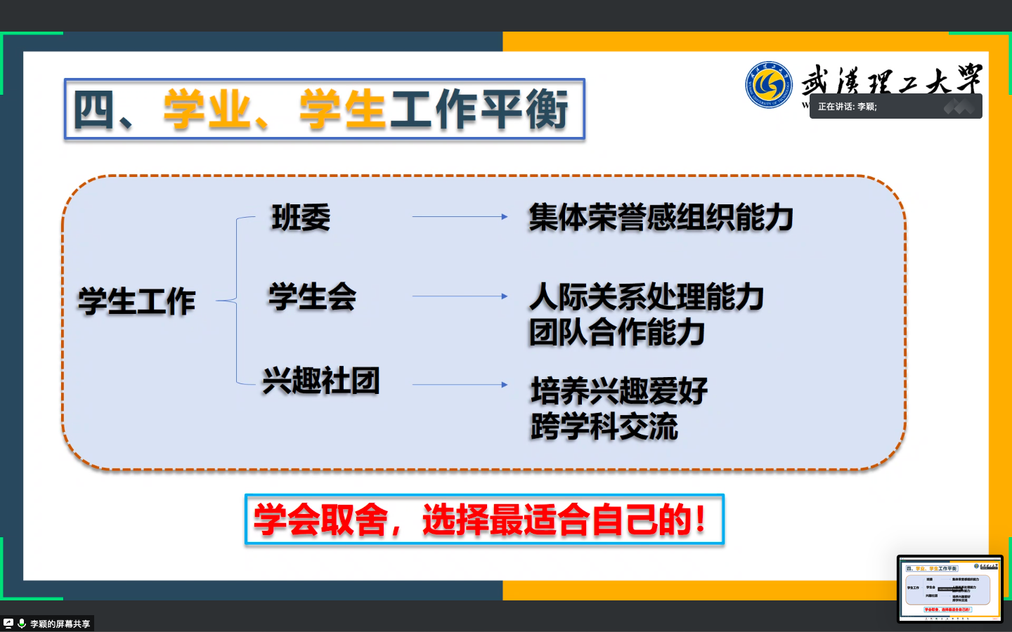 对于工作和考研这两项人生选择题,李颖也用自身经历向同学们阐述了生涯决策的方法和流程,并向云端的学弟学妹们分享了自己考研的心态与方法,引导大家学会如何明确自己的目标。她寄语同学们,做科研和考研都要不怕吃苦,具备扎实的专业知识,多观察,多思考。