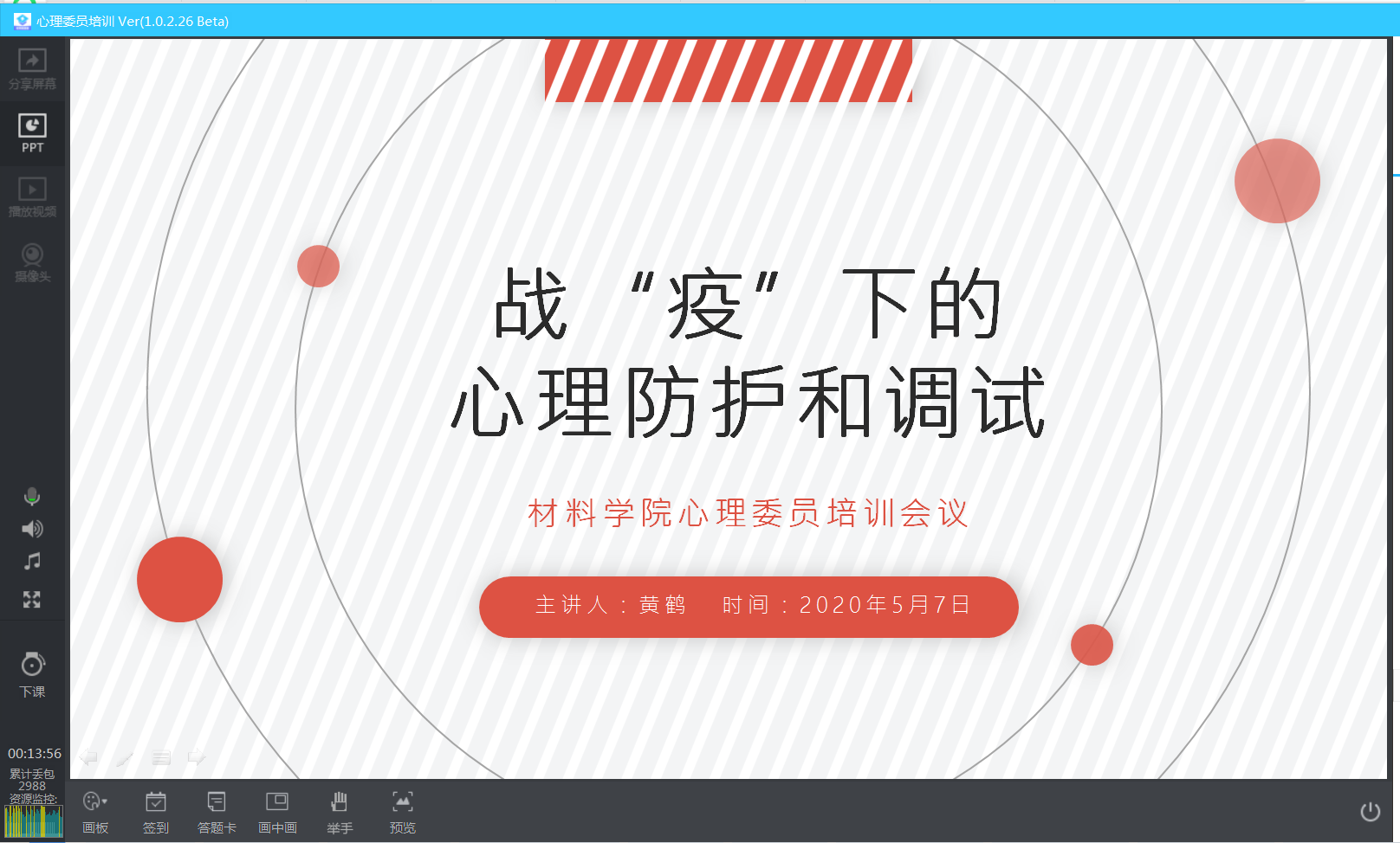 黄老师提出,自新型冠状病毒疫情发生,几乎每个人都不同程度地产生了心理应激反应,并且以恐惧、焦虑、忐忑、悲伤、内疚、压抑、抑郁、烦躁、迷茫、麻木等消极情绪为主要表现,甚至影响到了正常的学习、工作和生活。同学们要学会穿上“心理防护服”,助人自助,不向班级同学传递负面情绪,培育理性平和的健康心态,共同做好疫情防护。