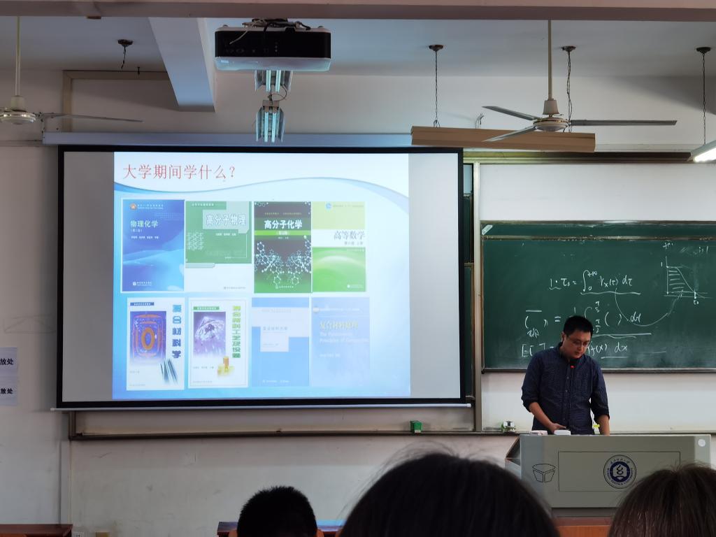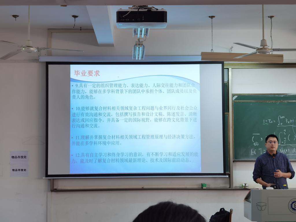 孙九霄老师简要介绍了复合材料与工程专业,分别从复合材料的应用、复合材料的培养方案、复合材料与工程系教师及主要研究方向三个方面展开。其中,孙老师分析了复合材料的特点及应用,并列举了复合材料在国防、航空、航天等尖端科学技术领域和汽车、电力、建筑、化工等生活领域的应用;又从培养目标、毕业要求、课程设置和研究方向方面剖析了复合材料学子的成才之路。