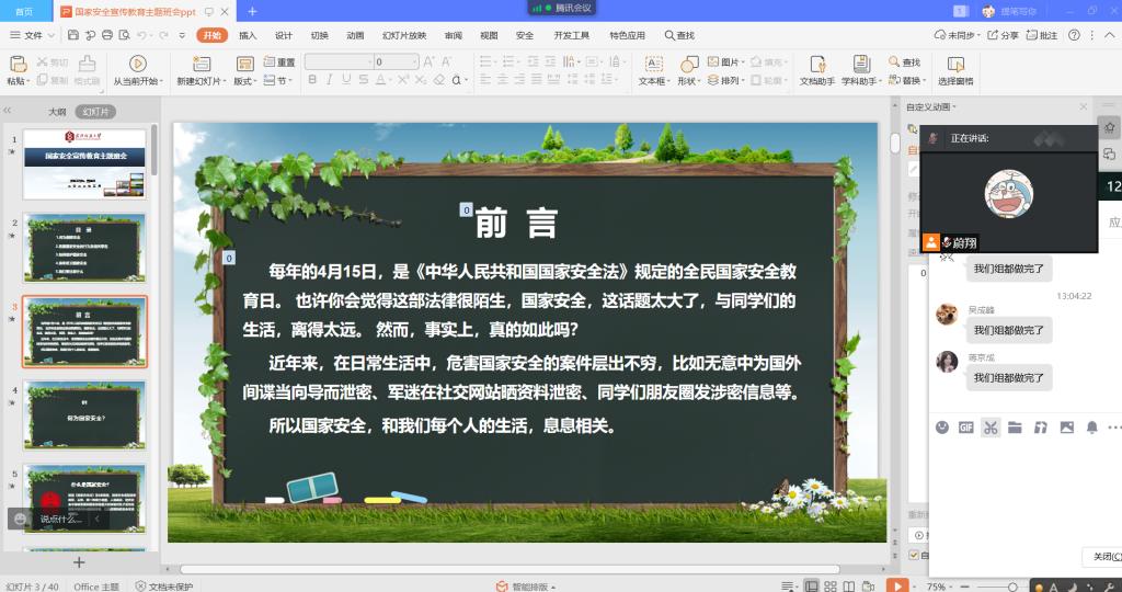 为推动国家安全教育工作深入开展,增强大学生国家安全意识,英国正版365官方网站于3月6日开展了“国家安全宣传教育”主题班会。会议由各年级辅导员组织,各年级全体同学在线参加。