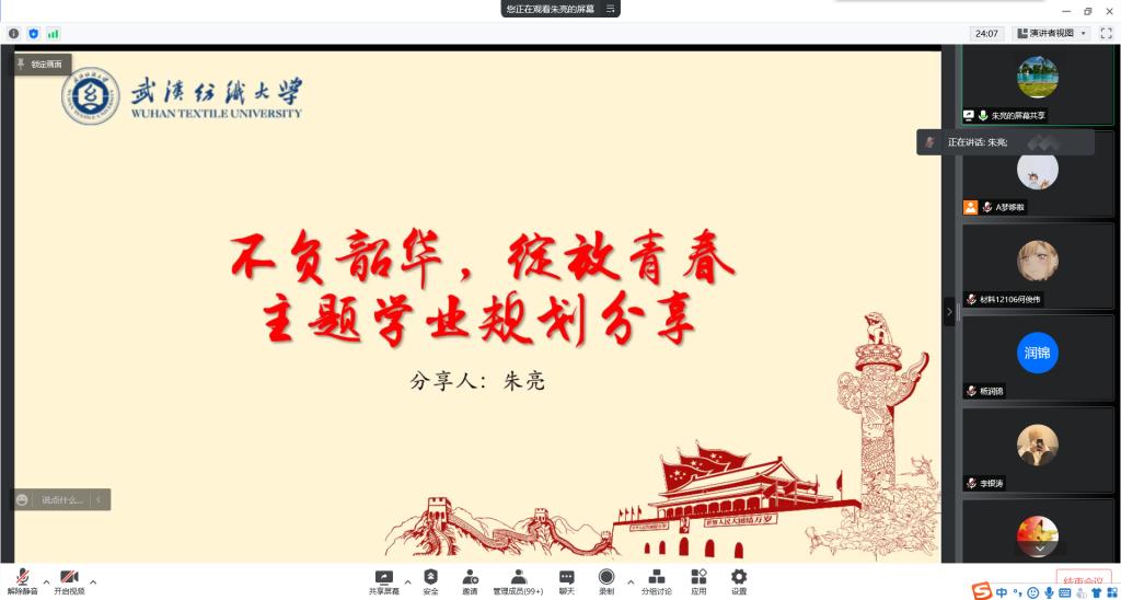 李翠,高分子11801班班长,带领班级获得先进班级体、十佳班团二等奖、五四红旗团支部等荣誉,班级同学累计发表论文、专业近十项,今年班级考研率居年级第一名,从班长的角度分享如何发挥作用、如何增强班级凝聚力,详细介绍了班风、学风建设的经验,提出每一位都是班级管理的参与者,要共同为班级建设做贡献。