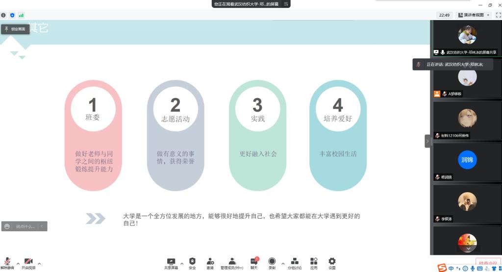 首先,辅导员王鑫老师通报了上学期期末考试成绩、挂科率,提醒同学们要完成好自己的首要任务;同时向同学们分享了学院今年的考研录取率,以此鼓励大一学生早谋划、早准备。随后4位主讲人依次分享。