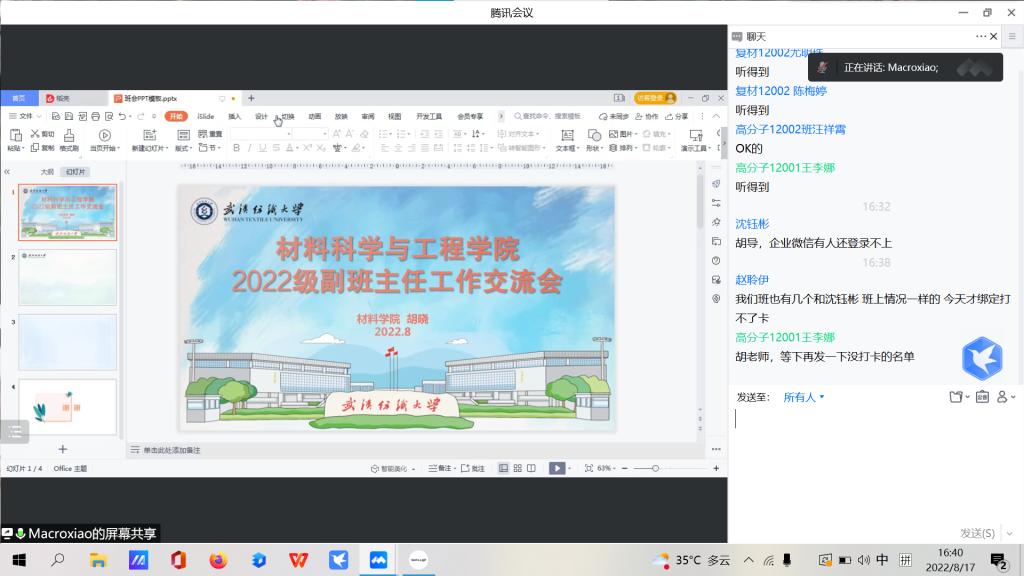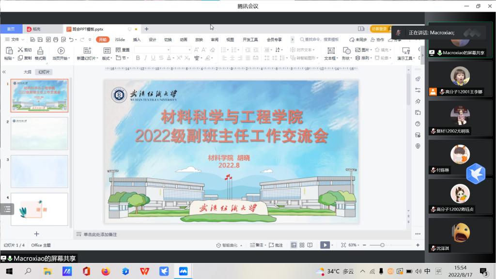 为促进新生尽快适应大学生活,了解学生思想与生活动态,切实做好新生班级管理工作,8月17日下午,英国正版365官方网站采用线上的方式召开2022级新生副班主任工作交流群。辅导员、16名全体新生副班主任参加,会议由2022级新生辅导员胡老师主持。