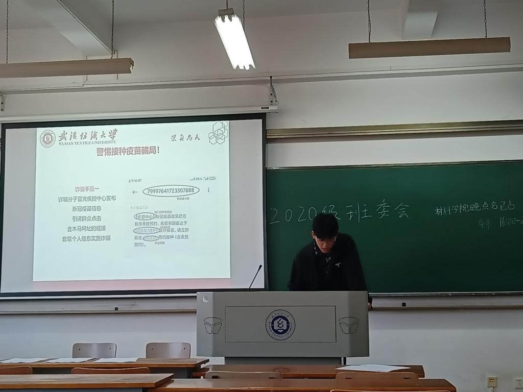班会还开展了防诈骗指南学习,揭露了新冠疫苗和音乐会的诈骗套路,组织签订了《武汉纺织大学防范电信网络诈骗告知书》及《武汉纺织大学防范电信网络诈骗承诺书》,提升了学生的防骗意识和防骗技能。最后,还就党的二十大精神在线知识竞答活动、举办第九届全国青年科普创新实验暨作品大赛(湖北赛区)、寻访“纺大群星”、兵役登记等工作进行了通知,集中观看了孝感市孝南区、宜昌市、宁波市、江阴市等四个地区的就业宣传片。