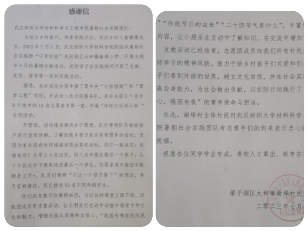 盛夏骄阳,逐梦前行。本次暑期夏令营的成功开办,不仅陪伴小朋友们度过了一个愉快的假期,而且受到了谢埠村当地村委会和村民朋友的热烈欢迎和广泛赞誉,取得了很好的效果和反响。五年级的小朋友谢经说,谢谢你们把我带入了一个自信心的团队,通过烦恼盒子,联欢会等活动,我觉得自己变得更加自信了,是你们让我更愿意去表达自己,这里也很好玩,,希望你们明年还来。二年级夏浩然的妈妈说,我家浩然每天都会很激动地回来跟我分享,今天志愿者老师教了他什么,他学到了什么,还会给我展示。他说每天和你们待在一起很开心,为了保证小朋友的安全,你们每天还保接包送,真的很谢谢你们这群志愿者的付出,你们辛苦啦。队长王江峰回忆这次夏令营时说,本次实践活动不仅给当地小朋友带去了知识和欢乐,同时让我们大学生感受到乡村是青年人的一片沃土,我们青年大学生需要去到乡村锻炼真实本领,乡村也需要我们大学生去奉献青春力量,这是一个“双向奔赴”的过程。