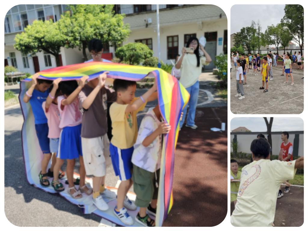 强健体魄,开展趣味运动。通过每天早晨的营舞练习和课间的体育运动,实践团成员通过组织开展篮球、足球、排球、跳绳等兴趣课,帮助小朋友们走出网络、走进操场,更好地接触自然、锻炼身体。实践团更是举办了一场妙趣横生的“跳房子”趣味运动会,孩子们在游戏中尽情释放活力,用快乐的童年记忆点亮乡村的夏日。