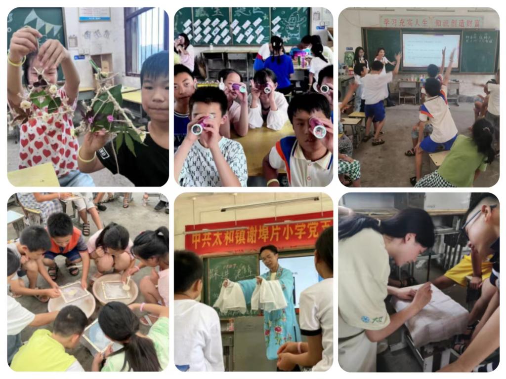 为深入学习贯彻习近平新时代中国特色社会主义思想,助力乡村振兴,传承传统文化,关注乡村儿童健康成长,武汉纺织大学英国正版365官方网站“宁芽织旅”实践团来到鄂州市梁子湖区太和镇谢埠小学,开展为期半个月的暑期支教活动。本次支教活动围绕“乡土中国”这一主题,结合实践团成员的专业和特长,设计了丰富多彩的活动,让孩子们在欢笑中感受中国传统文化的魅力,增强文化自信。